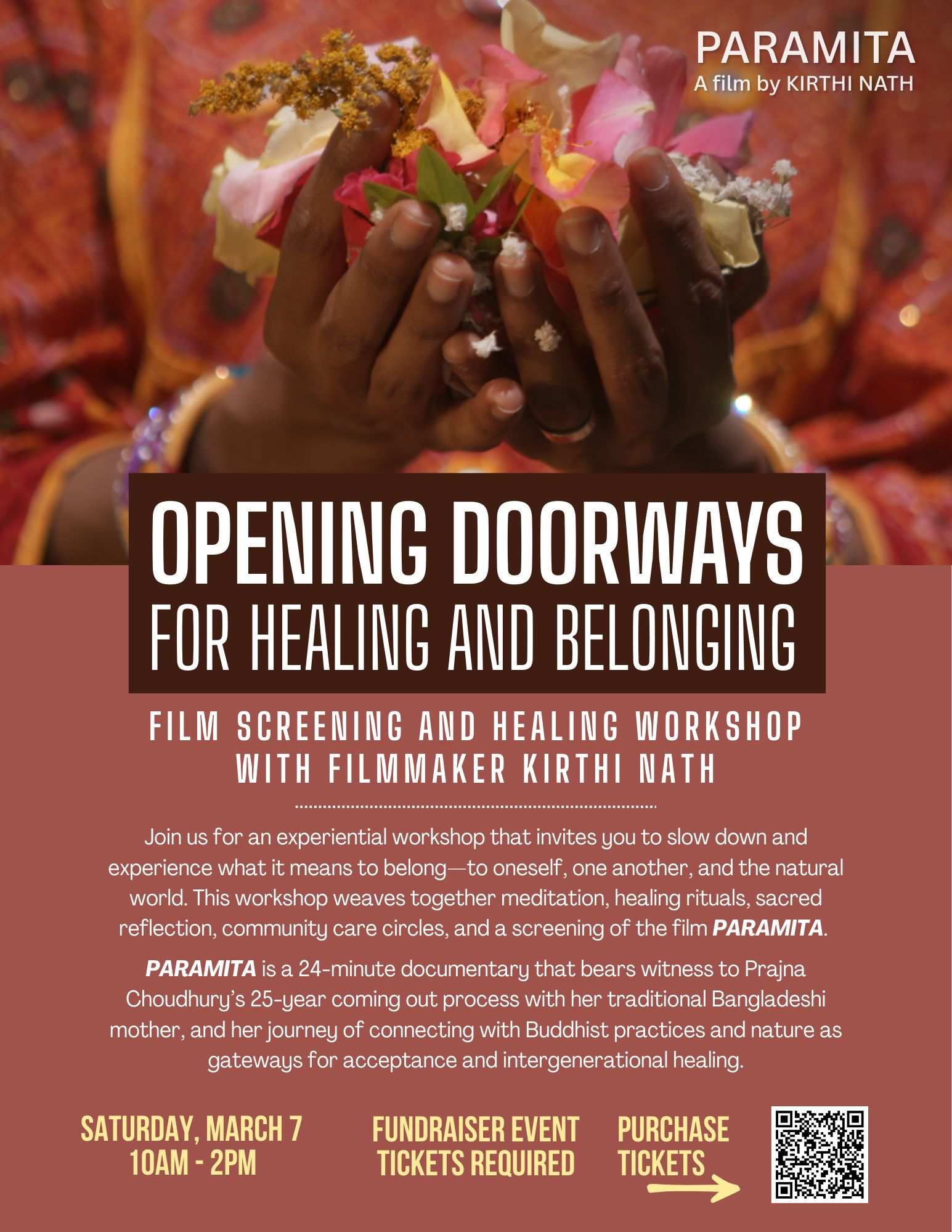 PARAMITA, directed by Re-Take Oakland filmmaker Kirthi Nath will have a film screening and healing workshop on March 7. This experiential workshop invites you to slow down and experience what it means to belong—to oneself, one another, and the natural world. The workshop weaves together meditation, healing rituals, sacred reflection, community care circles, and a screening of the film PARAMITA.